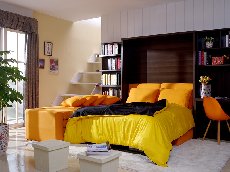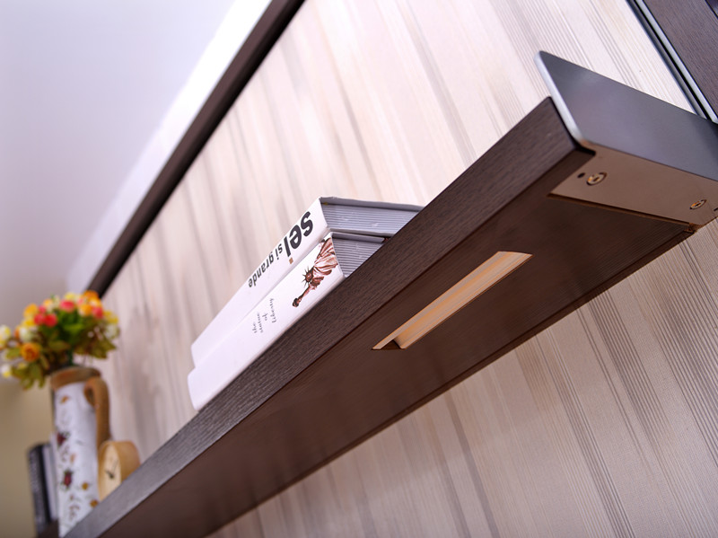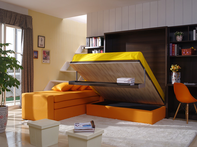本产品是一款带有转角沙发和附柜功能的正翻功能床,隐形床纵向立起藏于沙发背后的柜体中。表面看起来是一套放在客厅的普通转角沙发,实则把沙发上方书架拉下后,便会变出一张睡床,沙发坐垫和书架成为床体的落地支撑点。柜体旁边还配有储物柜,能够收纳床上的被子、枕头等寝室用品,方便实用。
