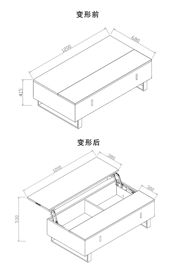 本产品是一款具有可变功能的茶几,茶几的半边桌面可随意拉升,升起后高度适中,可用作电脑桌、餐桌、书桌,茶几里还设计有两个储物抽屉,有很大的储物空间,方便储存日常家居用品。
